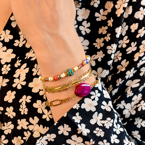 Boho-Schmuck ist diesen Frühling wieder in! Machen Sie sich diesen Trend zunutze und kreieren Sie Halsketten in verschiedenen Längen, die sich layern lassen. Arbeiten Sie mit Makramee-Bändern und Natursteinperlen für einen echten Boho-Look! Immer ein besonderer Blickfang sind Armbänder aus grobem Jasseron, woran Sie verschiedene Anhänger anbringen. Lange, schwingende Ohrringe und Handyketten mit groben Perlen dürfen in Ihrer Frühjahrskollektion natürlich nicht fehlen!