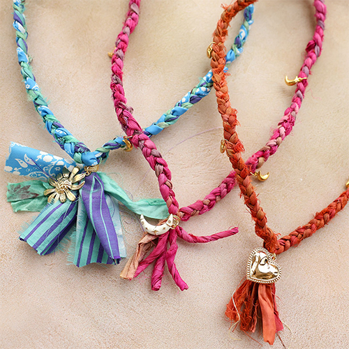 Die Seidenbänder dieser Serie leuchten in intensiven Farben wie Lila, Blau und Orange und sind aus recycelten Sari-Stoffen gefertigt – was jedes Stück nicht nur einzigartig, sondern auch nachhaltig macht. Zum stilvollen, handgemachten Look passen unsere neuen silberfarbenen Schiebeperlen aus DQ-Metall. Lassen Sie Ihrer Kreativität freien Lauf und fertigen Sie mit diesen Bändern individuelle Halsketten mit kleinen und großen Anhängern, elegante Ohrringe oder farbenfrohe Armbänder.
