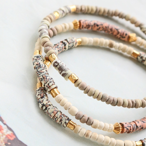 Diese super schöne Armbänder sind super. Wenn Sie die Katsuki Perlen mit Army print und Camouflage print mit den richtigen Artikeln kombinieren, machen Sie high end Design mit perfektem Look. Kombinier die Katsuki Perlen mit natürlichen Produkten wie z.B. Kokos Perlen, Natursein Perlen, Facett und Muschel Perlen disc. Verwend kleine Perlen aus DQ Metall mit vielen Details zwischen den Perlen. Reih die kleinen Perlen auf Metall Draht und verwend Quetschperlen um eine Lasche am Ende zu machen, um einen Bindering daran zu befestigen. Nehmen Sie einen Karabiner Verschluss als Verschluss dazu. Den übrigen Draht können Sie zurück stecken und abschneiden. Mit einer schönen Quaste oder DQ Metall Anhänger machen Sie das Armband komplett. Durch besondere Farbkombinationen auzuprobieren entwerfen Sie einen echten Blickfang. Super modisch also!