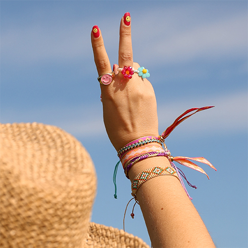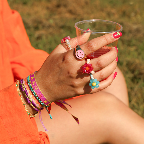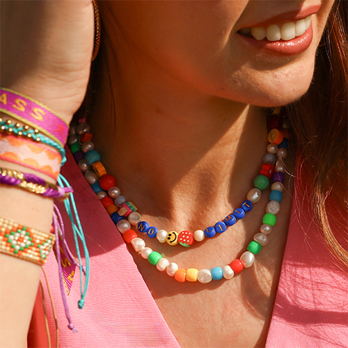 Hier eine exklusive Auswahl an Must-haves-Accessoires, die jedes Festival-Outfit perfekt ergänzen. Halsketten mit Acryl-(Buchstaben)-Perlen sind der absolute Hit dieser Saison. Kombiniert mit süßen Polymer-Früchtchen und die trendigen Keramik-Smileys verleihen sie jedem Outfit eine unwiderstehlich verspielte Note.
