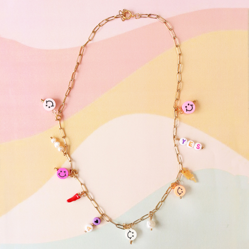Sind Sie bereit, super bunten und fröhlichen Schmuck zu entwerfen? Dann legen Sie los mit der neuen Polymerperlen-Kollektion! Sie können diese trendigen Halsketten mit klobigen Jasseron-Gliedern, großen Süßwasserperlen, Acryl-Buchstabenperlen und verschiedenen Anhängern gestalten. Polymer-Perlen sind sehr farbenfroh, aber Sie können die Artikel auch stilvoll verwenden. Machen Sie zum Beispiel ein Zwischenstück aus Süßwasserperlen und einer Polymerperle. Sie können dazu einen Kettennagel verwenden oder ein Stück Metalldraht an beiden Seiten der Kette befestigen. Kreieren Sie auch eine trendige Gliederkette durch verschiedene Charms zum Schmuck. Wie wäre es mit einem roten Paprika-Charme? Verwandeln Sie die Polymerperlen, wie z. B. die Smileys, einfach mit einem Kettenstift in einen Anhänger. Viel Spaß mit diesen fröhlichen Artikeln und werden Sie kreativ!