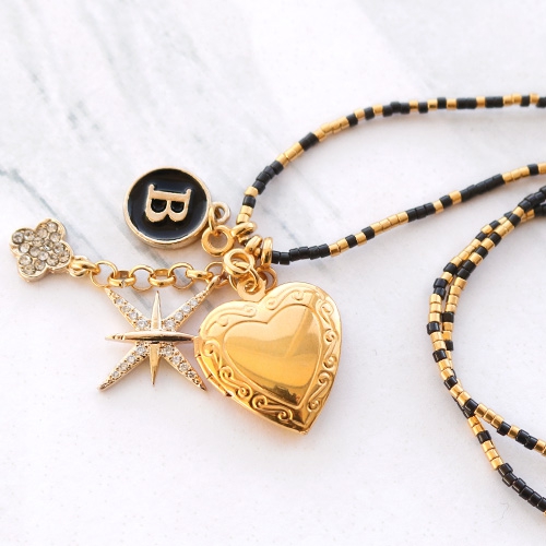 Wenn Sie auf der Suche sind nach Inspiration für die kommenden Feiertage, dann sind Sie hier an der richtigen Adresse! Es ist super schön, unsere neue Strass Kollektion, Buchstaben und Medaillon Anhänger zu einer prachtvollen Kette zu verwandeln. Wie Sie in dem Vorbild sehen können, haben wir eine goldene Ballchain Kette verwendet. Daran haben wir kleine Stücke Jasseron und Anhänger befestigt. Das gibt einen verspielten Effekt! Auch eine schöne Idee, ist es um die Kette auf Elastik zu reihen mit schwarzen und goldenen Miyuki Perlen an die Sie auch Strass, Buchstaben oder Medaillon Anhänger hängen.
