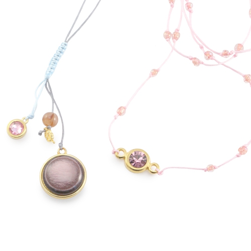 In diesem Inspirationsset sehen Sie einige Vorbilder von Schmuck aus Macramé Draht. Wir haben drei Armbänder gemacht. Das Armband selbst ist nicht geknüpft, sondern das Draht ist miteinander verbunden durch ein kleines Stück geknüpftes Macramé Draht. Die Enden sind miteinanderverbunden durch eine DQ Metall Kappe. Es ist super schön um verschiedene Farben Macramé Draht miteinander zu kombinieren in einem Schmuckstück. Die Armbänder sind verarbeitet mit einer Fassung aus DQ Metall speziell für 7mm Cabochon und Swarovski SS34 flatback Stein, einer Swarovski Fassung und DQ Metall Anhänger mit zwei Ösen. Wir haben noch zwei Ketten gemacht. Eine Kette hat ein Polaris Elements mit zweiseitiger Fassung und einem schönen Cabochon. Und es ist eine Kette gemacht mit einer Swarovski Fassung und SS39 Stein. Der Draht dieser Kette ist mit schönen Rocailles verarbeitet.