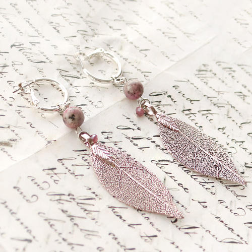 Schlüsselanhänger + Ohrringe mit echten Blättern, Natursteinperlen und Macramé Band