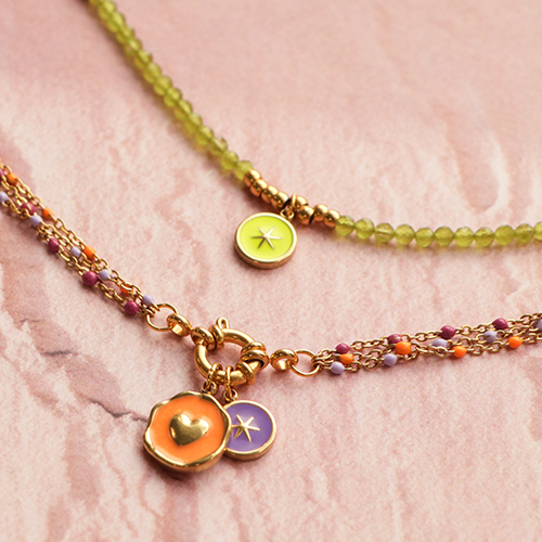 Diese farbenfrohen Anhänger eignen sich perfekt für Halsketten, die man einzeln oder zusammen tragen kann. Um einen besonders schicken Look zu erzielen, fädeln Sie auf Nylonfaden ein paar kleine Süßwasserperlen und einen Anhänger. Fertigen Sie daraus eine kleine Schlaufe, die Sie dann an eine Jasseron-Kette hängen. Sie können auch verschiedenen Perlen, wie z. B. facettierten Natursteinperlen auffädeln und daran einen Anhänger befestigen. Auch bunte Jasseron-Ketten sehen mit diesen Anhängern toll aus!