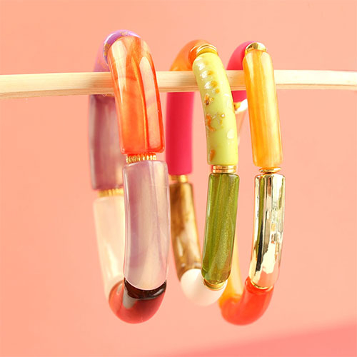 Diese Tube Acrylperlen Shiny in frühlingshaften Farbtönen sind ideal, um eine fröhliche Armbandkollektion zu entwerfen. Benutzen Sie elastisches Fädelmaterial und bereits mit 5 bis 6 Tubes lassen sich Armbänder erstellen . Kombinieren Sie die Tubes mit z. B. DQ-Metallperlen oder griechische DQ-Keramikperlen in passenden Farben. Die Armbänder schließen Sie mit einem Kreuzknoten und einem Tropfen Schmuckkleber. Um den Knoten zu verbergen, schieben Sie einfach eine der Perlen darüber.