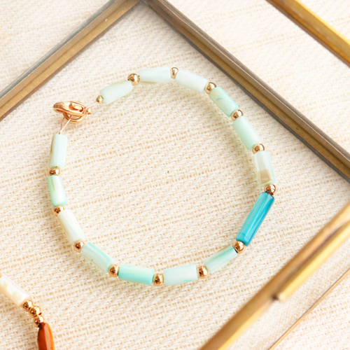 Die Tube Muschel Perlen standen im Mittelpunkt dieses Sommerschmucks. Diese wunderschönen Perlen sind in verschiedenen Farben erhältlich, jede mit einem wunderschönen perlmuttartigen Glanz. Dies verleiht Ihrem Schmuck einen zusätzlichen auffallenden Effekt. Sie können die Muschel Perlen verwenden, wenn Sie trendige Armbänder herstellen möchten. Reihen Sie die Tube Muschel Perlen in Kombination mit DQ Metall Perlen auf Metalldraht und befestigen Sie am Ende einen Verschluss. Verleihen Sie dem Armband eine zusätzliche Note, indem Sie in der Mitte eine Kaurimuschel oder einen schönen DQ Metallanhänger anbringen. DQ Leder und Muschelperlen sind auch eine wunderbare Kombination. Nehmen Sie zwei Lederstücke und befestigen die Tube Muschel Perlen dazwischen. Diese Perlen setzen Sie fest mit Reihdraht. Sie schliessen dieses Armband, indem Sie einen Knoten und eine Schlaufe in das Leder machen. Viel Glück!