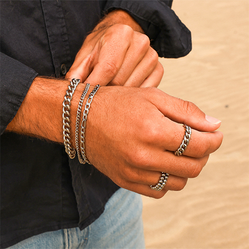 Oder verleihen Sie Ihrer Kollektion mit fertig konfektionierten Armbändern und Ketten in silberfarbenem Look den letzten coolen Schliff.