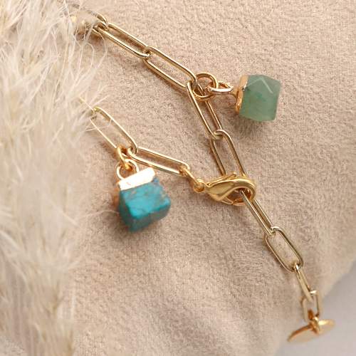 Suchen Sie noch Ideen, wie Sie diese modischen Schmuckanhänger aus Naturstein in Ihre Kollektion einbinden können? Entwerfen Sie lange Halsketten und mit einem Anhänger als Blickfang an einer Jasseron-Kette oder an einer Kette, auf die Sie bereits Natursteinperlen aufgefädelten haben. Armbänder können schnell mit elastischem Garn hergestellt werden. Verwenden Sie Natursteinperlen im Wechsel mit goldenen Miyuki-Perlen. Oder machen Sie ein trendiges Bettelarmband mit einer groben Jasseron-Kette, an die Sie verschiedene kleine und größere Natursteinanhänger mit Hilfe eines Biegerings hängen.