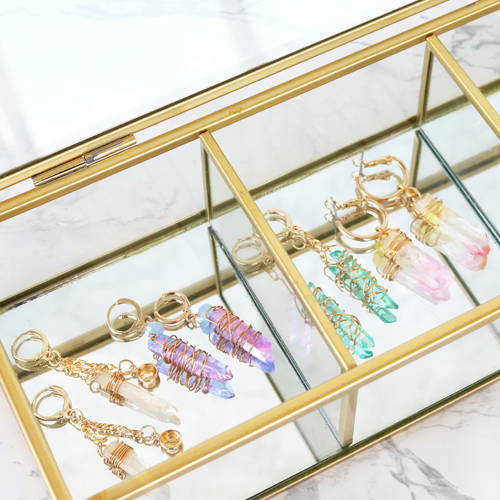 Dieser subtile Schmuck aus Aura Quarz würde sich in Ihrer Kollektion gut präsentieren. Wir haben bereits Ohrringe hergestellt, um Sie zu inspirieren. Diese Ohrringe wirken aufgrund der verwendeten Materialien sehr luxuriös. Aura Quartz ist ein stabiles Material von schöner Qualität, das den Ohrringen einen exklusiven Look verleiht.