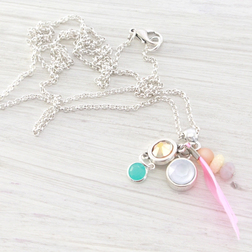 Diese Sommer Edition Swarovski Stein ist absolut schön für den Sommer! Der Swarovski Kegelstein hat eine puderartige Beschichtung. Das gibt dem Chaton einen Opal Look! Dieses Inspriationsset besteht aus verschiedenen Armbändern, Ohrringen und einer Kette. Die Kette ist gemacht mit Jasseron, schönen Perlen, einer Feder und Swarovski Kegelstein. Wir haben auch ein luxuriöses Love Crystal Armband gemacht mit DQ Metall Schiebern und Rivoli 1122 – 12mm Kegelstein. Die Luxus Ohrhänger sind mit DQ Metall Fassungen gemacht und Swarovski SS29 und SS39 Kegelstein. Zum Abschluss haben wir noch Doppelarmband mit Love Crystal / Rivoli Fassung/Verteiler gemacht.