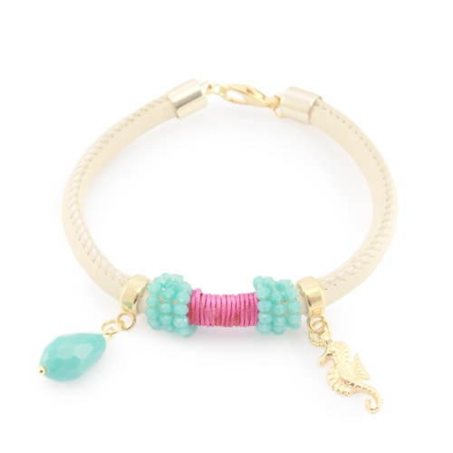 Der Sommer hat jetzt endlich angefangen! Also höchste Zeit um wieder fröhlichen Sommerschmuck zu tragen. Dieses Inspirationsset besteht aus hübschen Armbändern aus gestepptem Imitat Leder, Facett Perlen, Muschelperlen und Dreamz Band. Die Farben des Dreamz Band sind super fröhlich! An dem Dreamz Band ist ein DQ Metall Schieber in Kombination mit einem 12mm Polaris Cabochon verarbeitet. Es gibt ein Imitat gestepptes Leder Armband aus Macramé Draht und Facettperlen mit Elastik drum herum gereiht. Um das andere Imitat Leder Armband gesteppt ist Dreamz Band gewickelt in Kombination mit Macramé Draht. Um alles einen schönen Abschluss zu geben, können Sie Sommer DQ metall Anhänger oder Quaste an diese Armbänder verarbeiten.