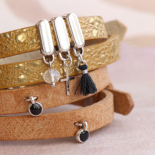 Suchen Sie Ideen für eine stilvolle Armbandkollektion? Dann sind diese Cuoio-Armbänder mit den passenden Schiebeelementen und Cabochons genau das Richtige. Alternativ können Sie Nieten aus der Swarovski Elements-Kollektion verwenden. Wenn Sie eine Niete mit Swarovski-Cabochon am Armband anbringen, müssen Sie einen weichen Untergrund wählen, um den Stein zu schützen. Zum Befestigen eines Anhängers oder einer Gliederkette am Armband kneifen Sie mit einer Lochzange zwei kleine Löcher nebeneinander. Führen Sie einen offenen Bindering durch die Löcher und schließen Sie diesen. Bringen Sie dann den Anhänger oder die Gliederkette an diesem Bindering an.