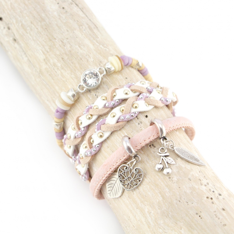 Die neutralen Farben in diesem Inspirationsset geben ein zartes Aussehen und sind dadurch einfach zu kombinieren! Wir haben Kokos Perlen verwendet. Dadurch erhalten die Armbänder die natürliche Ausstrahlung. Das super Imitat Leder mit Strass und Nieten erhält die zarte Ausstrahlung durch die Lila Farbe und die Art, wie es geflochten ist. Die Farbe des Imitat Leder Armbandes ist palerosé. Eine prachtvolle Farbe, die das ganze komplett macht! Bei allen Armbänder ist verschiedenes DQ Metall Zubehör verarbeitet.