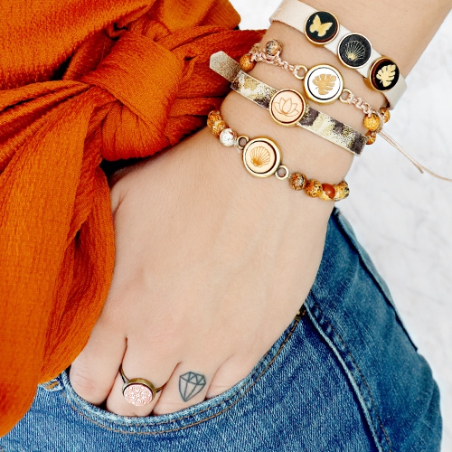 Schmuck mit einer natürlichen Ausstrahlung in leichten Tönen sind perfekt für den Sommer! Die Holz Cabochons in metallic und natürlichen Holz Farben sieht super aus in einem Set aus diesen Farben. Für dieses Schmuck Set verwendeten wir verschiedene Techniken wie Techniken aus Macramé Band in 1 mm kombiniert mit Natursteinperlen. Auch verwendeten wir das sommerliche Reihmaterial gestepptes Ibiza Band in diesem Set! Das letzte Reihmaterial das wir verwendeten, war Silk Style genähte Kordel, we love it! Das einfachste, aber sicher genauso schöne Schmuck in diesem Set haben wir mit unseren Fertig Schmucksets für eine Ring oder Ohrring gemacht, in die Sie ganz einfach einen Cabochon mit einem Tropfen Schmuckkleber kleben können.